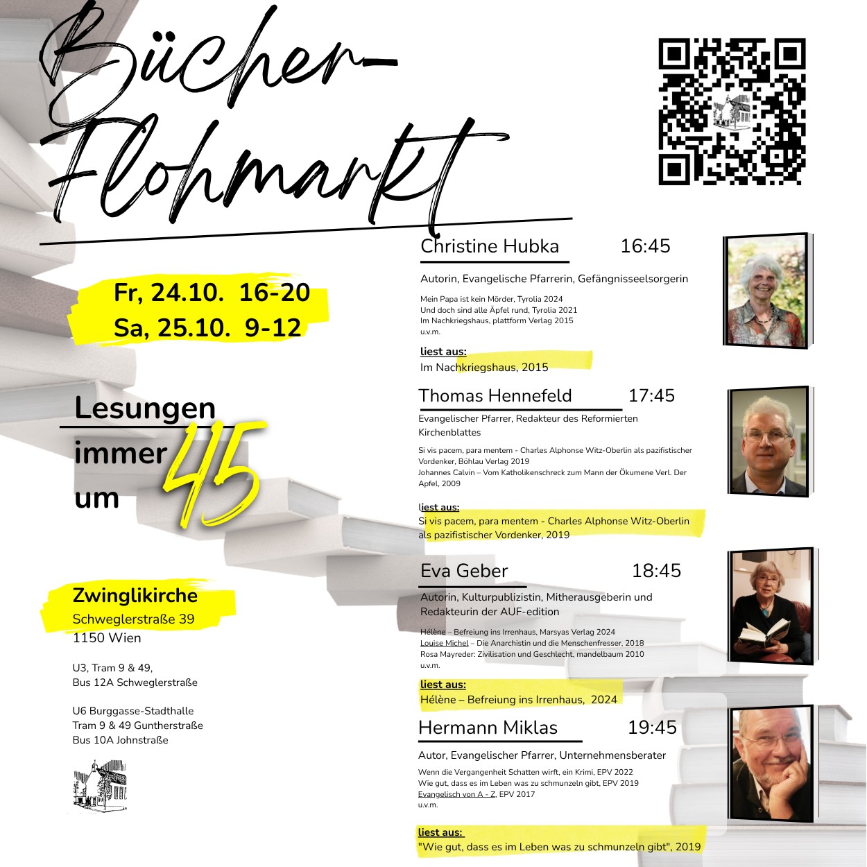 Zwinglikirche Schweglerstr. 39Zweimal jährlich veranstaltet die Zwinglikirche den großen Bücherflohmarkt – ab Herbst mit neuem Konzept! Fr 16:00–20:00 und Sa 9:00–12:00 finden paralell zum Flohmarkt in der Kirche Lesungen von Autor*innen statt: Wir freuen uns sehr auf