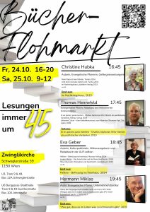 Fr 16:00–20:00 und Sa 9:00–12:00 finden paralell zum Flohmarkt in der Kirche Lesungen von Autor*innen statt: