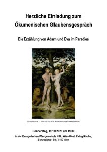 Link zum Vortrag „Die Erzählung von Adam und Eva im Paradies – Hintergründe und Deutungsmöglichkeiten“ von Prof. Annette Schellenberg (Evangelisch-Theologische Fakultät der Universität Wien) am 28. September in der Zwinglikirche / 1150 Wien.